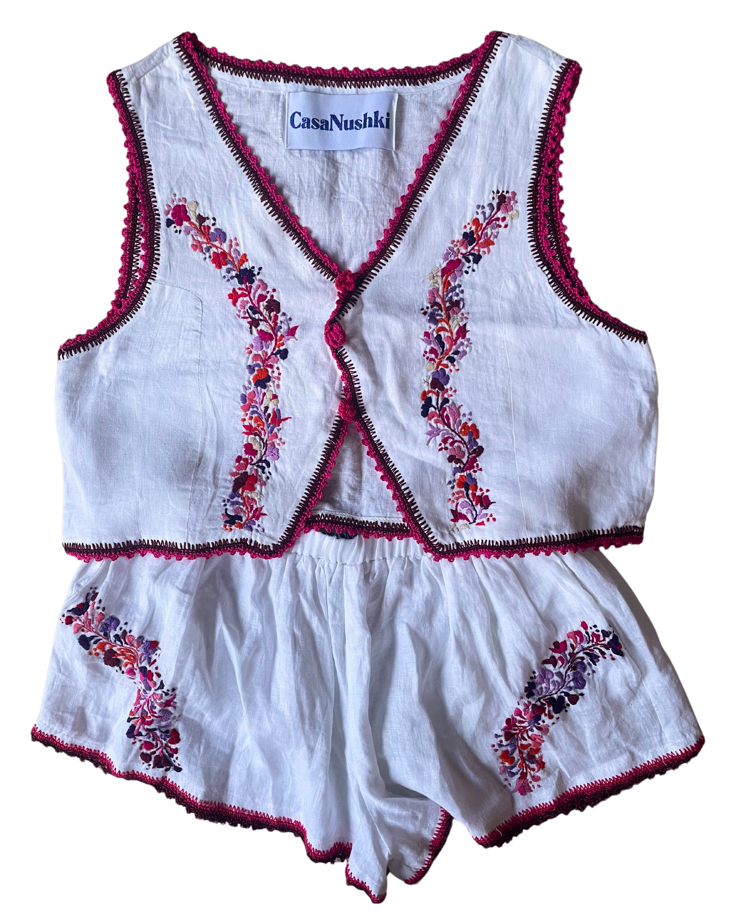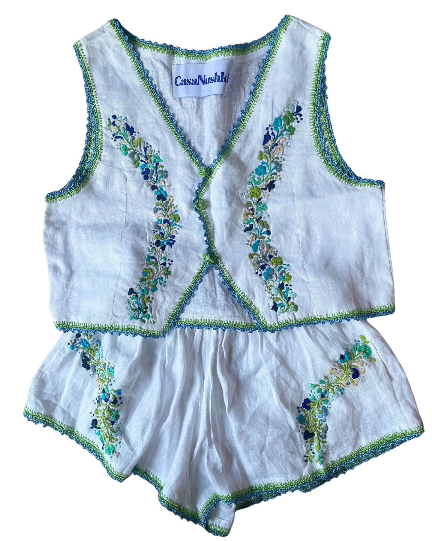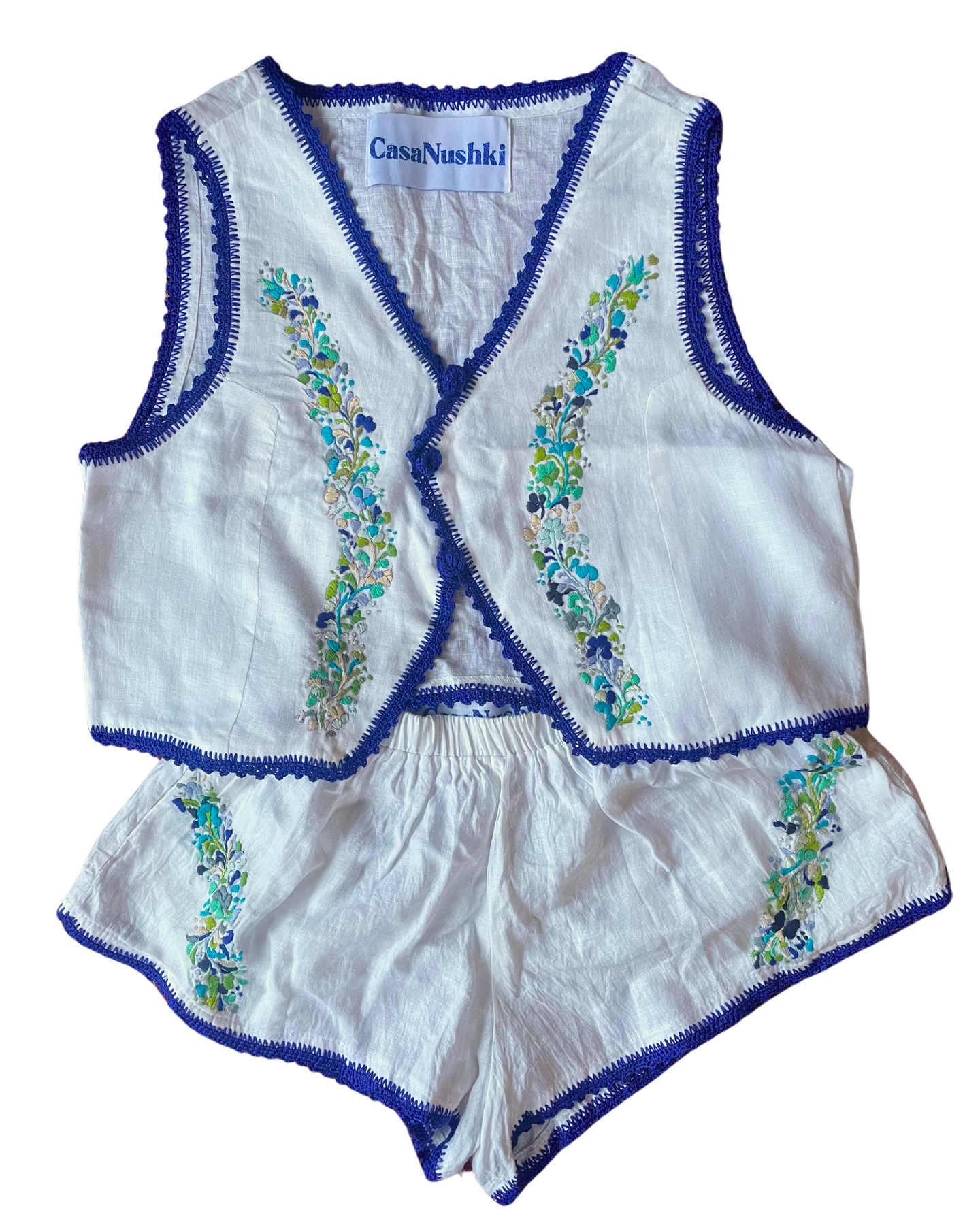 Sizing: Waistcoat with adjustable tie-back; shorts fit UK 8–10 comfortably. Care: Hand wash cool, air dry flat.