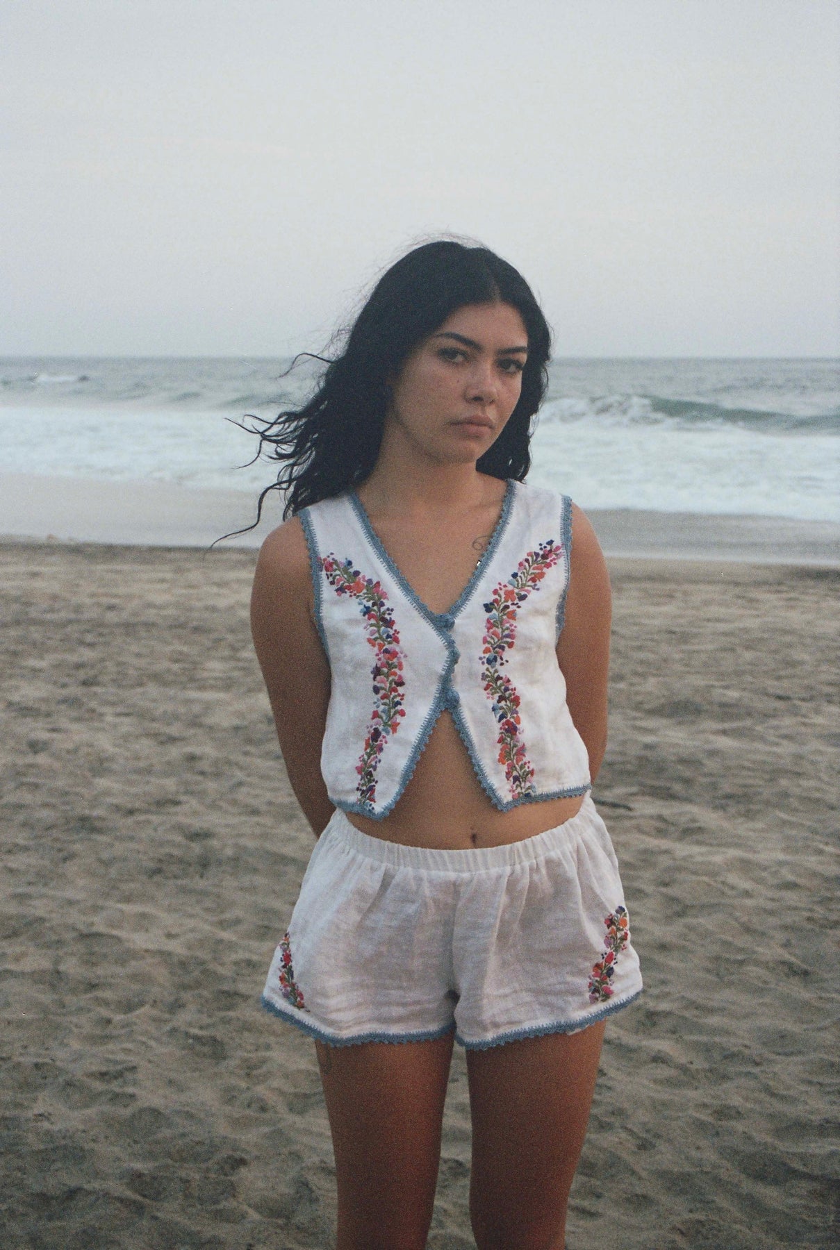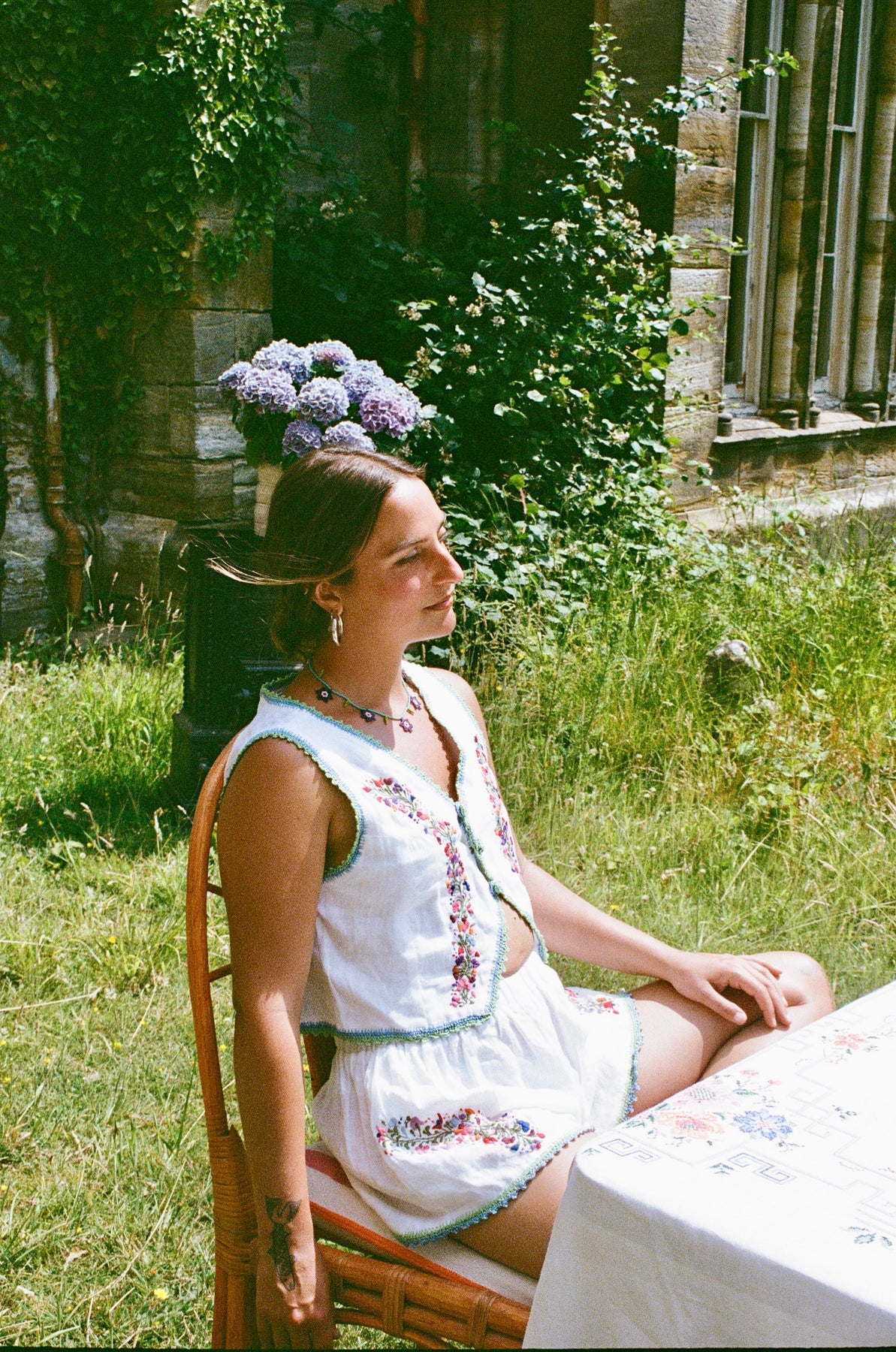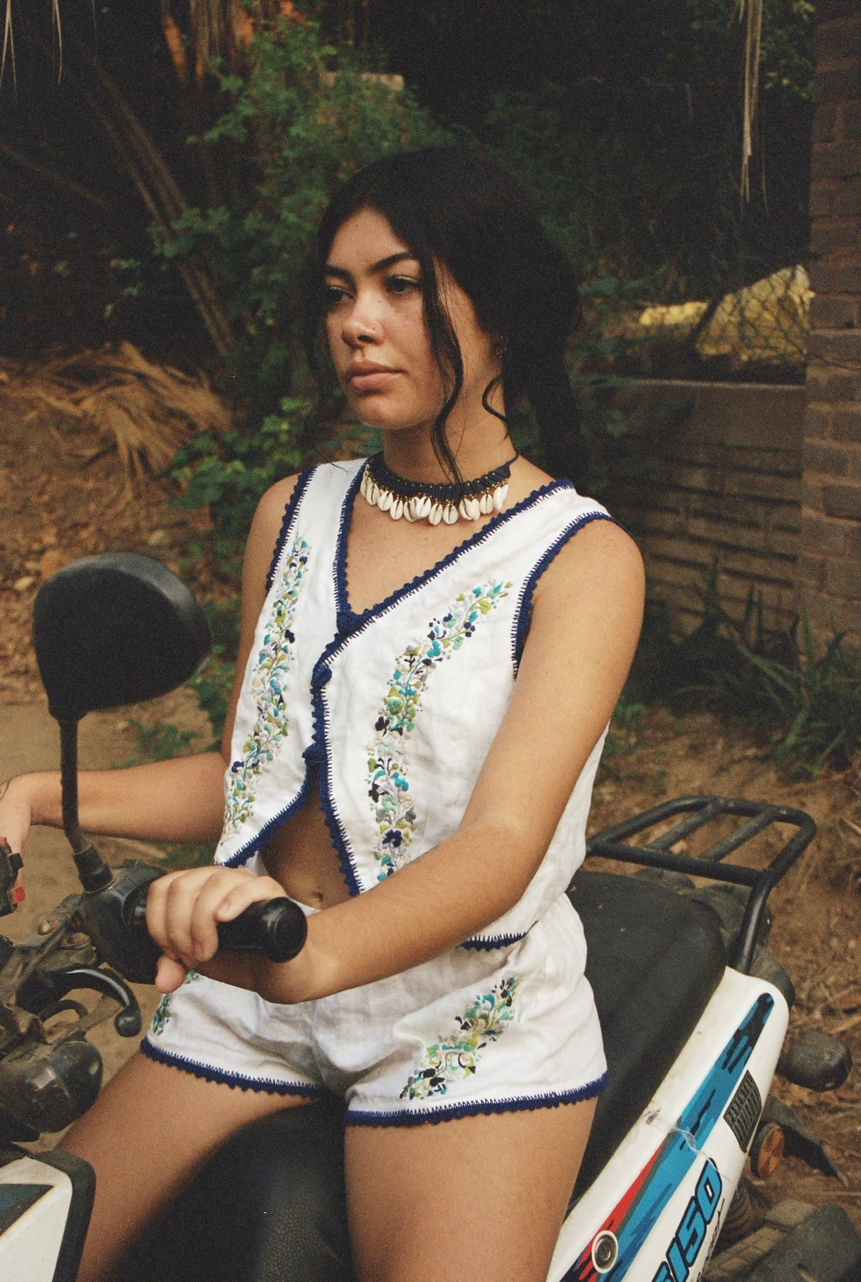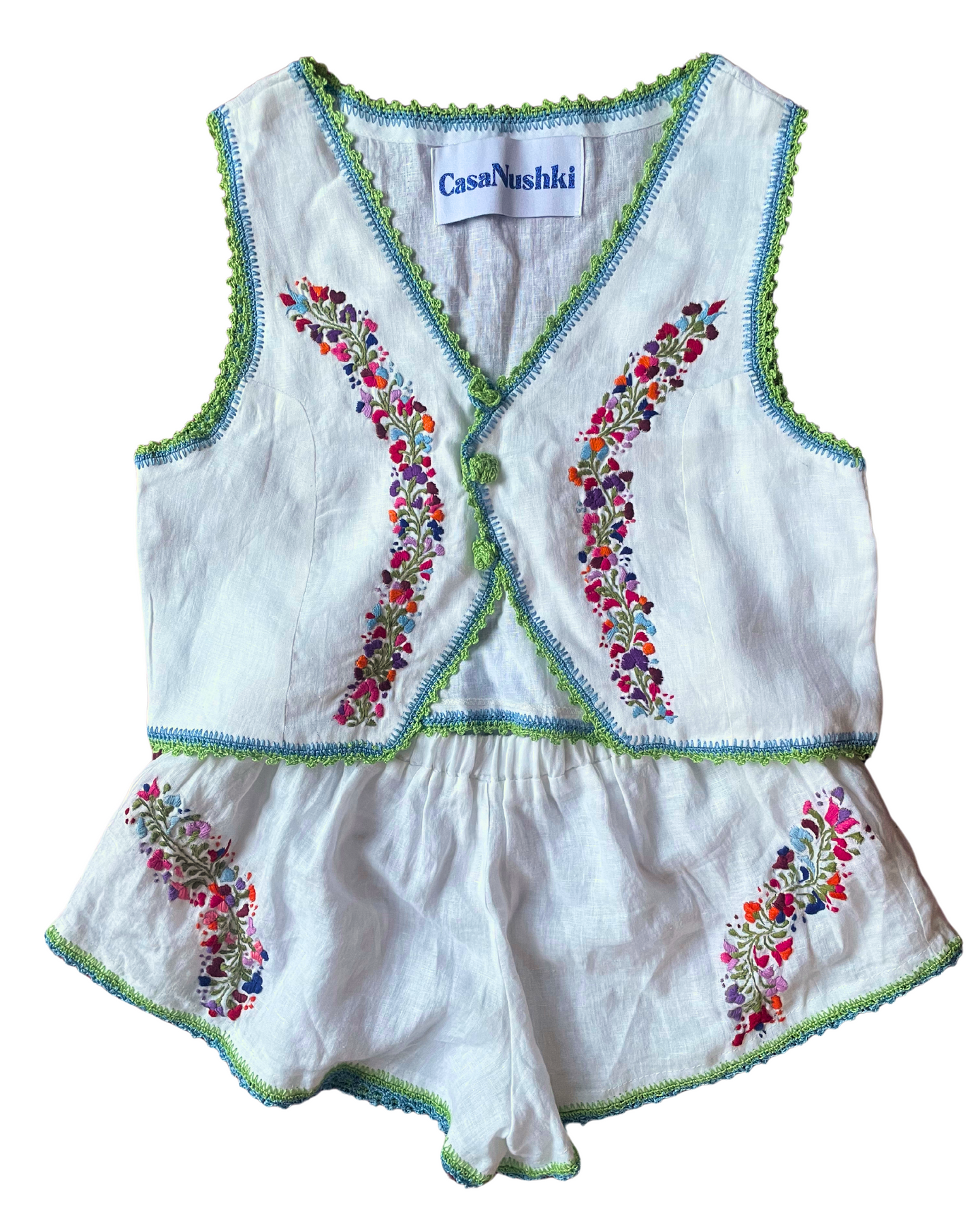 Sizing: Waistcoat with adjustable tie-back; shorts fit UK 8–10 comfortably. Care: Hand wash cool, air dry flat.