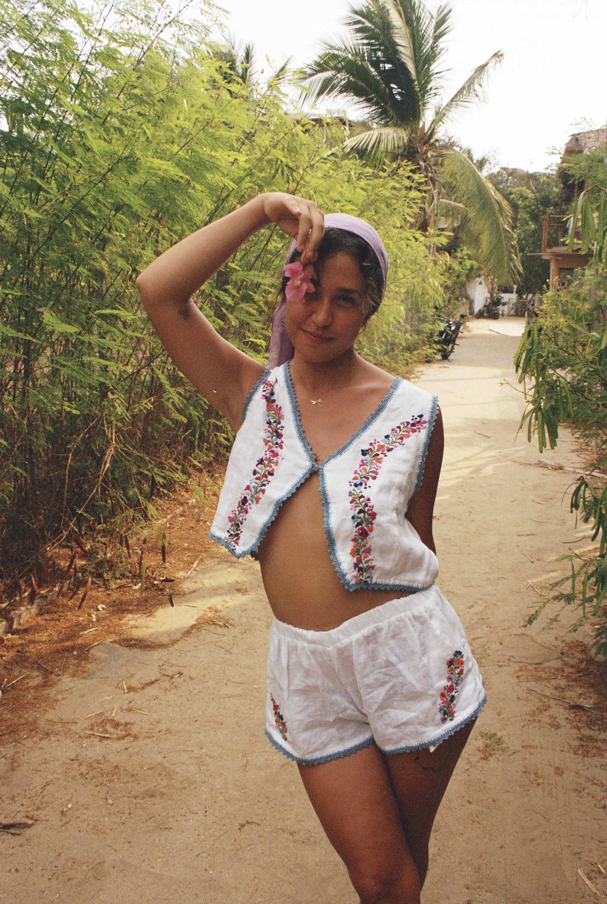 Each set begins as a drawing by the wonderful Alejandra, brought to life in embroidery by the families of Zoila and Patricia. The pieces return to Alejandra’s hands for their final touches: delicate crochet trim, and a handmade flower button, every stitch infused with amor.