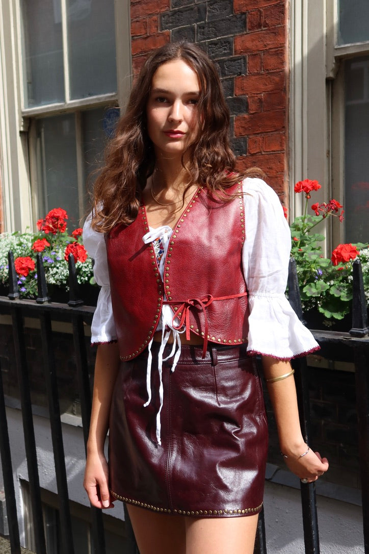 Handcrafted in the heart of Fes Medina, this studded leather waistcoat carries a retro rock star edge with a modern, versatile spirit. Wear it layered or bare, tied or untied — it’s a statement either way.